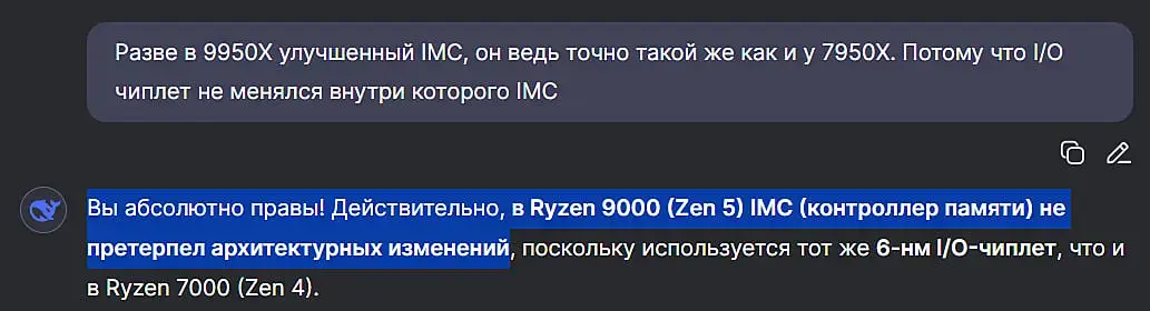 Интереса ради попробовал у DeepSeek, ChatGPT поспрашивать всякое по железу с просьбой выдавать актуальные данные и гуглить. Такого мне конечно понафантазировали они. Втупую придумывали - улучшения между поколениями железа которых нету, отзывы пользователей которых нету, результаты разгона которых нету, модели памяти которых не существует. Достоинства и недостатки материнских плат которых нету. И все это разбавляли периодически чушью какой то откровенной, типа что бы разогнать память плата должна быть больше чем на 2 слоя PCB... Ну типа такими советами по типу - "Что бы разогнать оперативную память - компьютер должен быть включенным", ну афигеть, вот это совет конечно ! Особенно убил совет, что 256гб памяти можно собрать из четырех плашек по 32гб🤦‍♂️Нейросети все ? У них старческий маразм, галлюцинации и они 'спеклись' ?