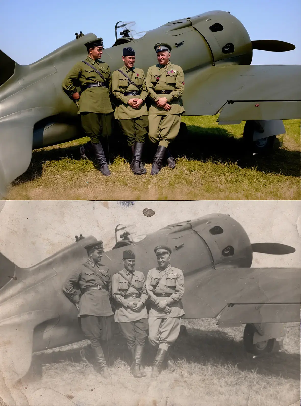 А у меня вот так вышло. Указал что цвета формы советских солдат, что самолёт это Истребитель И-16, убрать дефекты. 12 минут считало. В фотошопе чуть уменьшил контраст и канал красного, больше никаких редакций. По середине мой прапрадед командир эскадрильи.