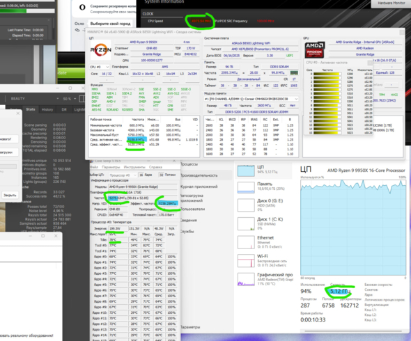 Curve Optimizer -30 на CCD с Кэшом, -25 на Частотный CCD. PBO - 230PPT / 180TDC / 225EDC / fMax +200 / Scalar не трогал. VRM у платы вкрутил в максимум по частоте. LLC подогнал что бы во время рендера в короне VCore был не больше 1.13V