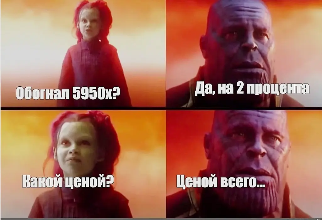 Соответственно и на разницу в цене, разница в производительности будет. Но все еще теплится надежда, когда блогеры выставят сравнение в синебенче. До 10% в пользу 5950х мне терпимо. Больше уже не особо. Тем более что надо переплачивать за ДДР5. Поскольку майнинг в Китае все, возможно к весне цены на видюхи упадут и можно будет уже рассматривать АМД платформу.