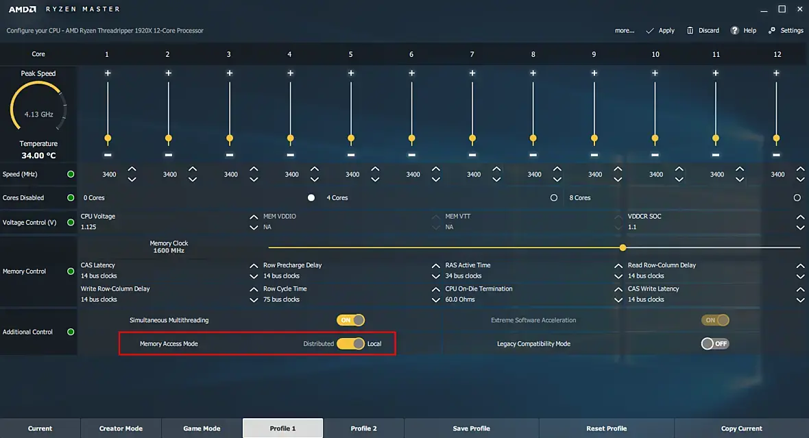 Как у вас установлены модули памяти на материнке, по мануалу? Память должна быть в разных сторонах от цп. Также проверьте локальный или распределенный режим работы памяти включен.