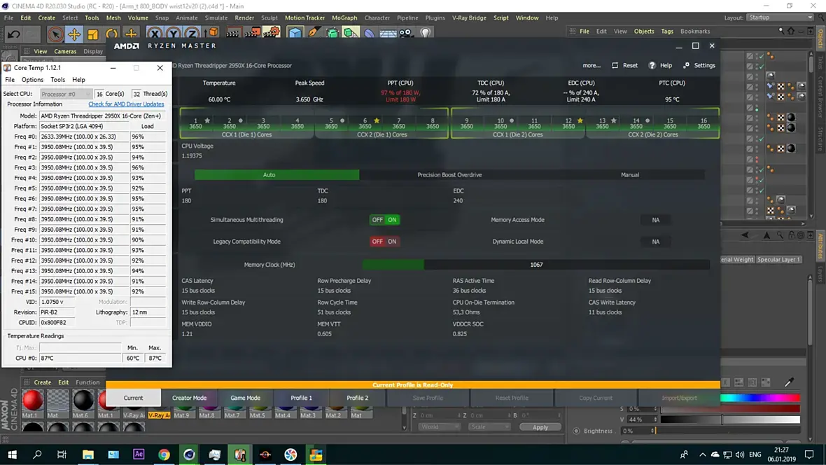 1920x, 3.8Mhz, вольтаж в райзен мастере выставлен 1.275, сво - cooler master 360 tr4. На выходе из корпуса, сзади дует холодный воздух, сверху от сво - теплый.