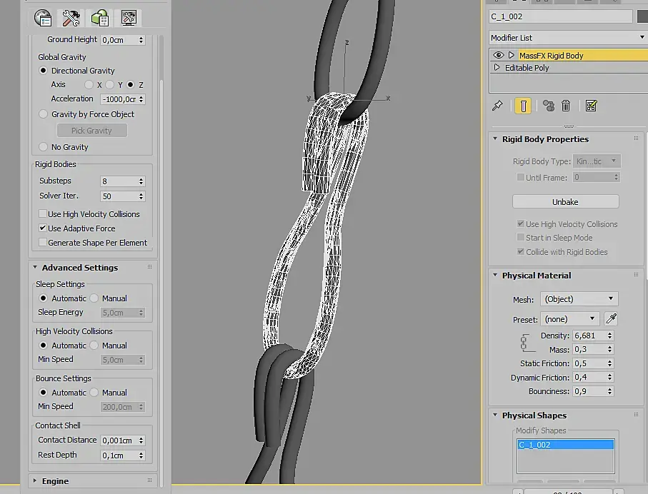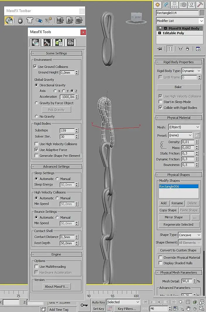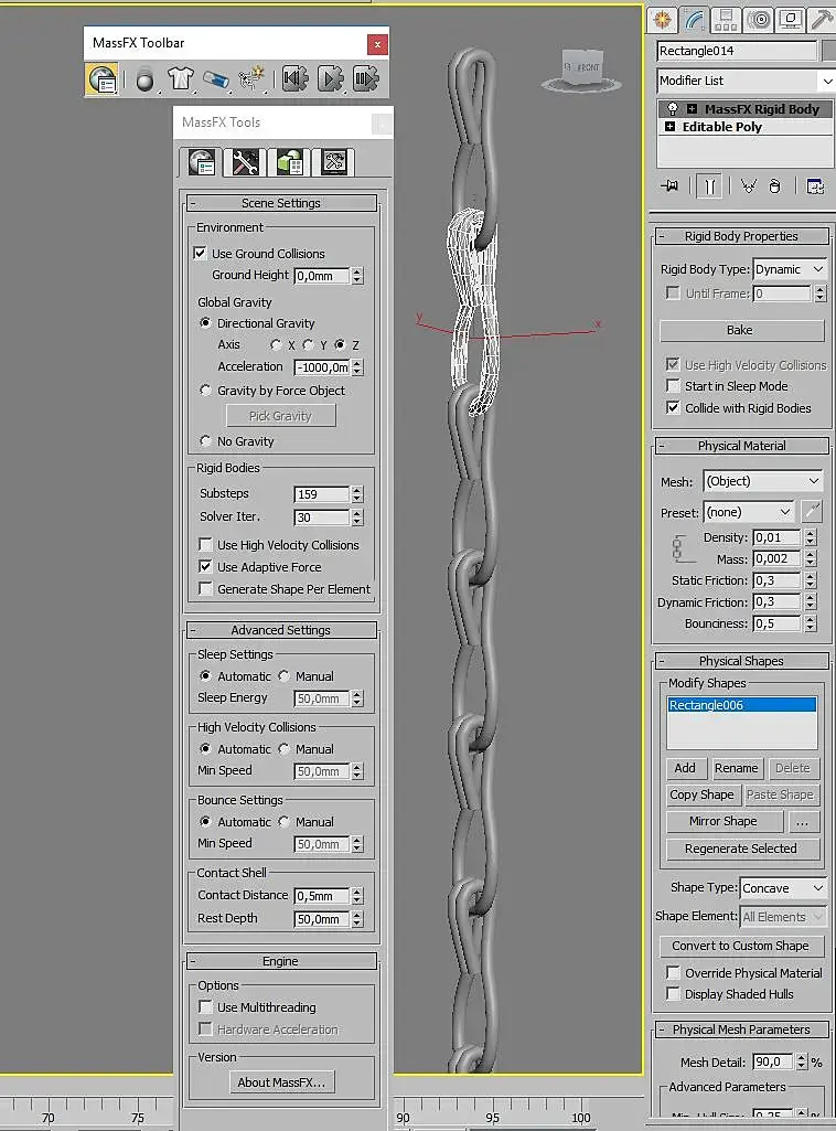Что то сейчас столкнулся с подобной задачей и нифига не получается хотя даже цепь попроще, обычные овальные звенья. Не пойму что делаю неправильно, вроде одно звено делаю статиком чтобы на нем все остальные повисли, остальные динамики, по настройкам использовал все как выше из скрина, нажимаю start simulation и ничего не происходит. При этоом в этой же сцене делаю что то попроще типа кубик уронить на все работает прекрасно