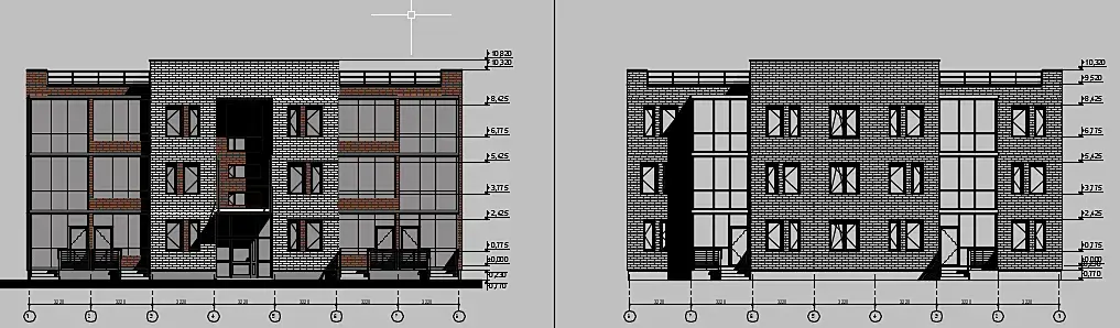 Развертка фасада - слева проекция с модели, справа вставленные проекции с других разверток.