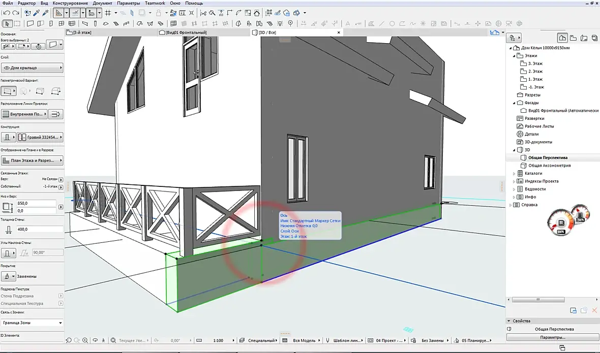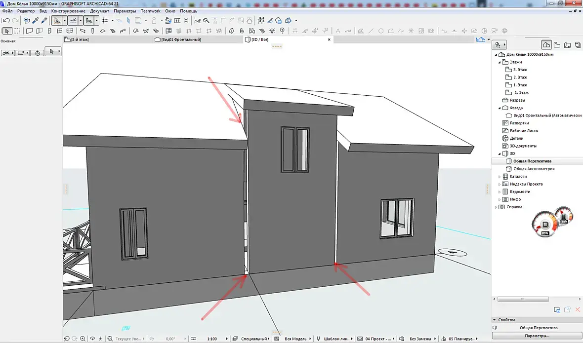 1. Почему у меня при подрезке стен крышей, наружняя стена рассекается внутренними стенами в двух местах. Как этого избежать? Может я крышу неправильно выстраиваю. У меня двускатная крыша отдельная и отдельно малая односкатная над слух. окном.