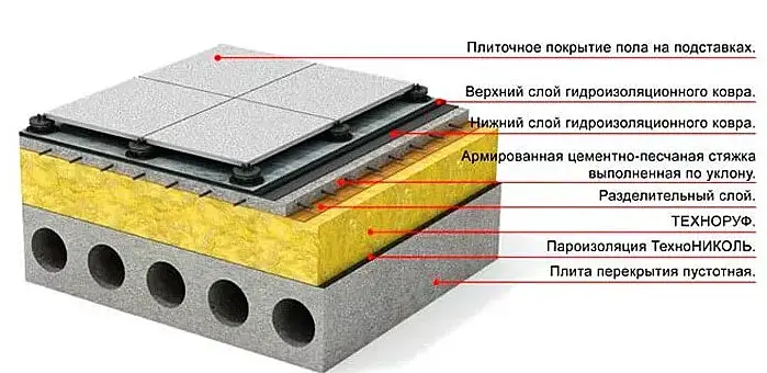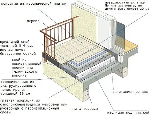 Помимо плиты перекрытия, толщина вот этого пирога сантиметров 20-25, верно? (подмосковье). С уклоном понятно, лагами (мне кажется) логично регулировать высоту, если разница в 5-10 см была бы. А тут именно терраса льется ниже сантимов на 25 (значительно). Потому вопрос не столько с водой и стыками покрытий, сколько именно с тем, как жб заливать, с перепадами или нет.