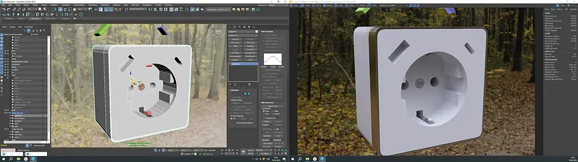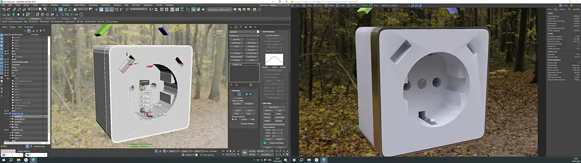 Доброго времени суток, я новичок в 3ds max, поэтому прошу не судить строго. Возникла такая проблема: при наложении фасок на ребра разъемов USB в розетке на рендере появляются "заломы" и тени от них, хотя во вьюпорте ничего такого нет. Все ребра находятся на одной плоскости. Прилагаю скриншоты (на первом сама проблема, на втором без фаски). Вопрос: из за чего такое может происходить, как избавиться, где я допустил ошибку?