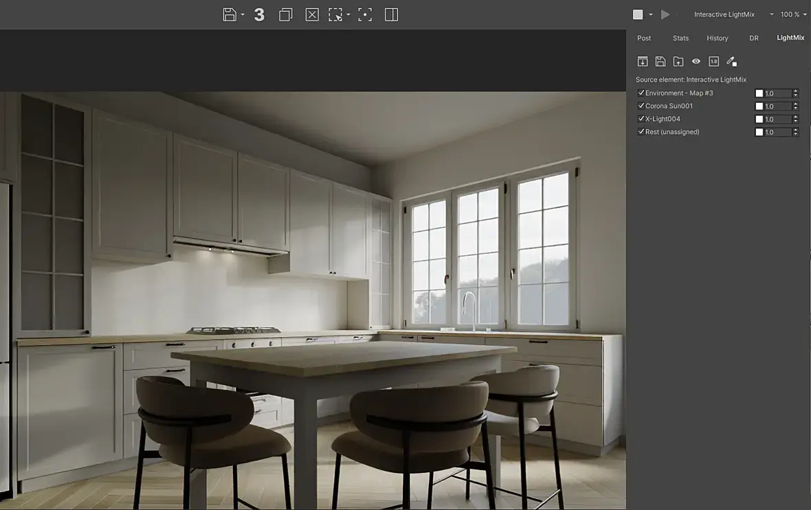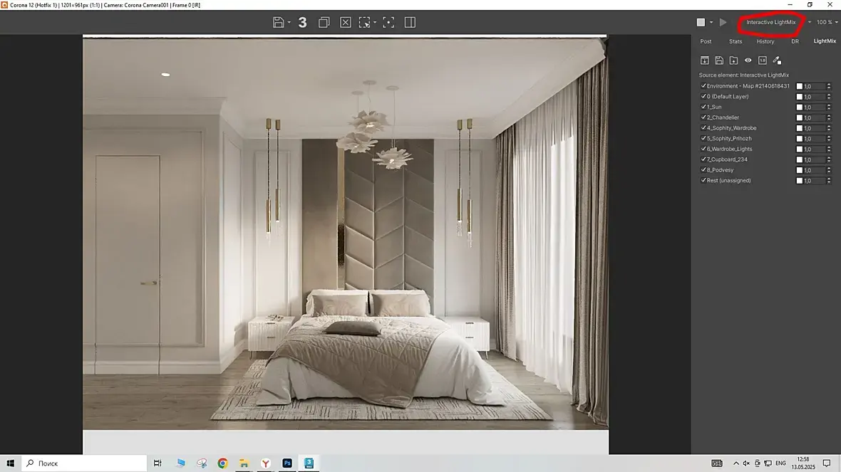 Включён Light Mix во время интерактивного рендера, но все значения на единице, цвет источника освещения (в LightMix) не изменён. Но разница в цветопередаче между Beauty и Light Mix очевидна. Кто может подсказать, в чём может быть дело?