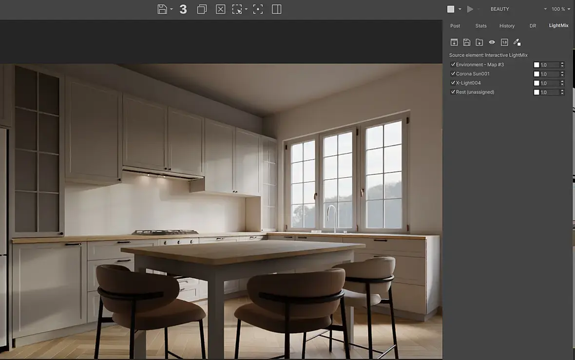 Включён Light Mix во время интерактивного рендера, но все значения на единице, цвет источника освещения (в LightMix) не изменён. Но разница в цветопередаче между Beauty и Light Mix очевидна. Кто может подсказать, в чём может быть дело?