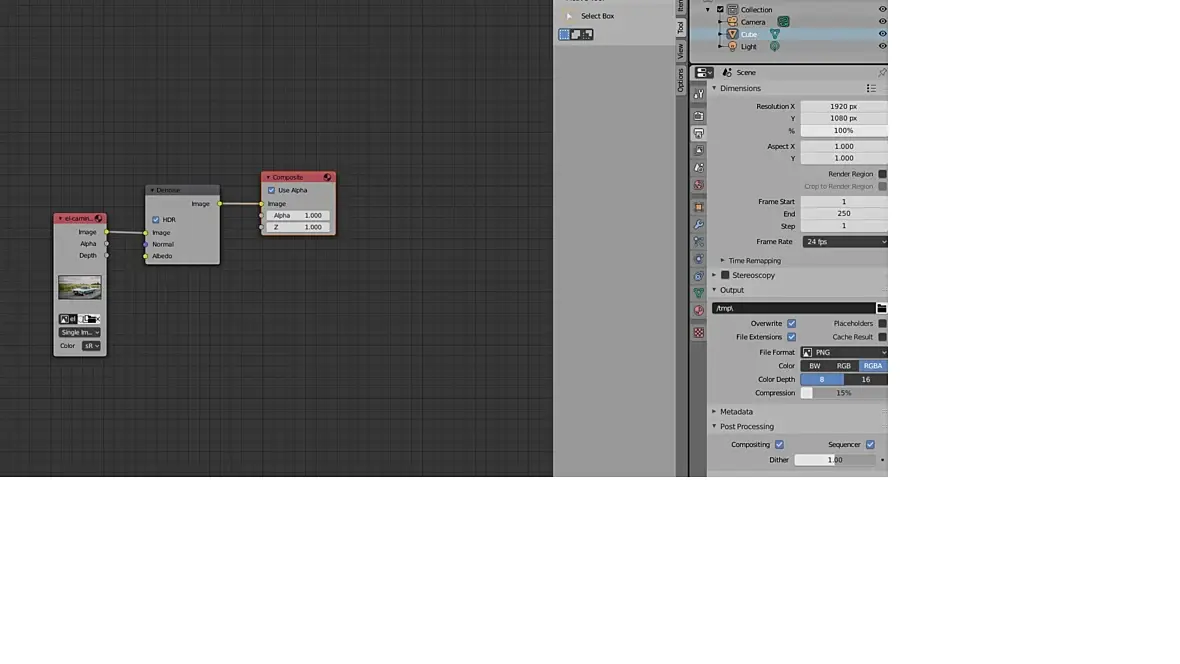 Имеется секвенция картинок, загружаю её в Compositing.. подключаю к ней ноду Denoise...
