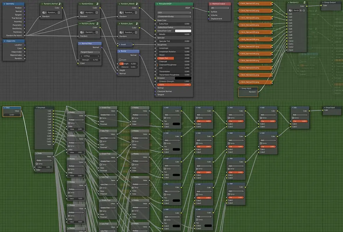 непонятно зачем? Одной текстурой лучше - просто надо рандомное положение ей сделать через геометри нод. Выше скрин уже выложили. И оттенки разные также через геомтри нод.