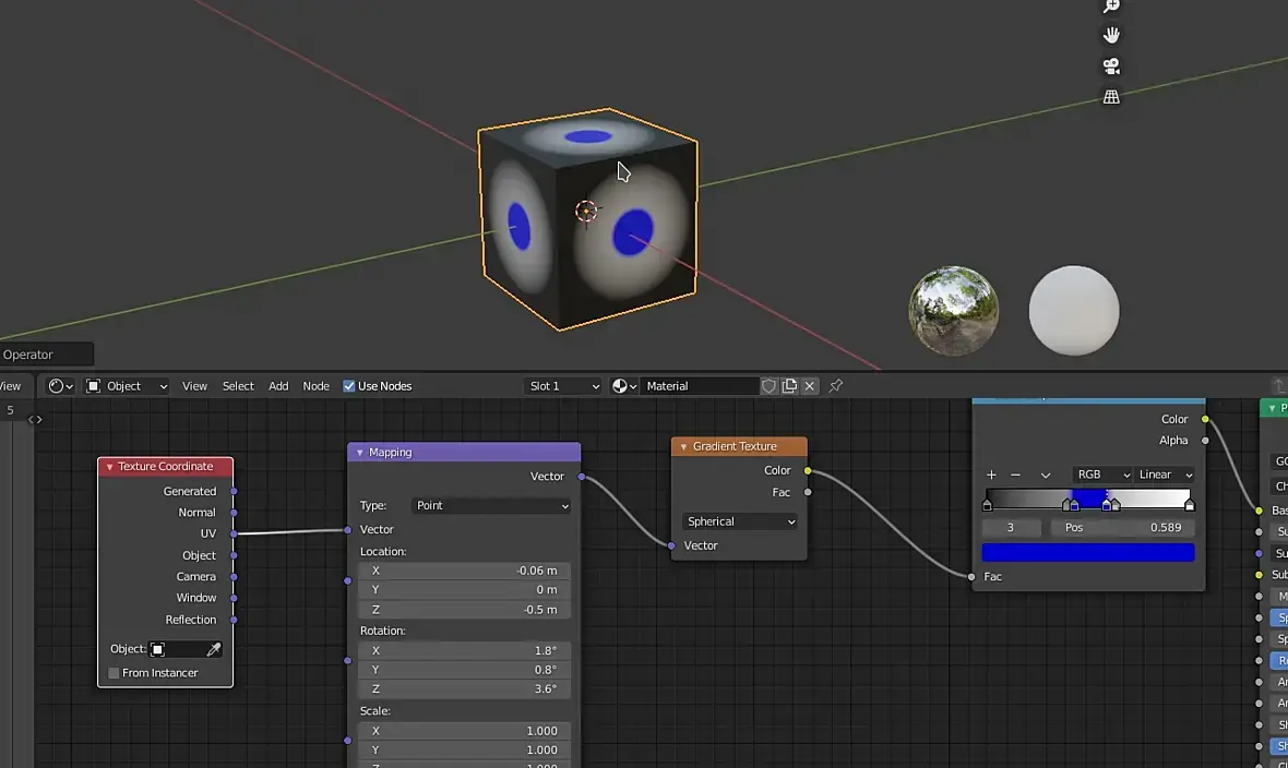 Столкнулся с такой задачей: почему-то эффект Spherical или Quadratic Sphere у ноды Gradient Texture работает с обратной стороны объекта. Обратите внимание на ось координат: фигуры перевернуты кверху ногами.