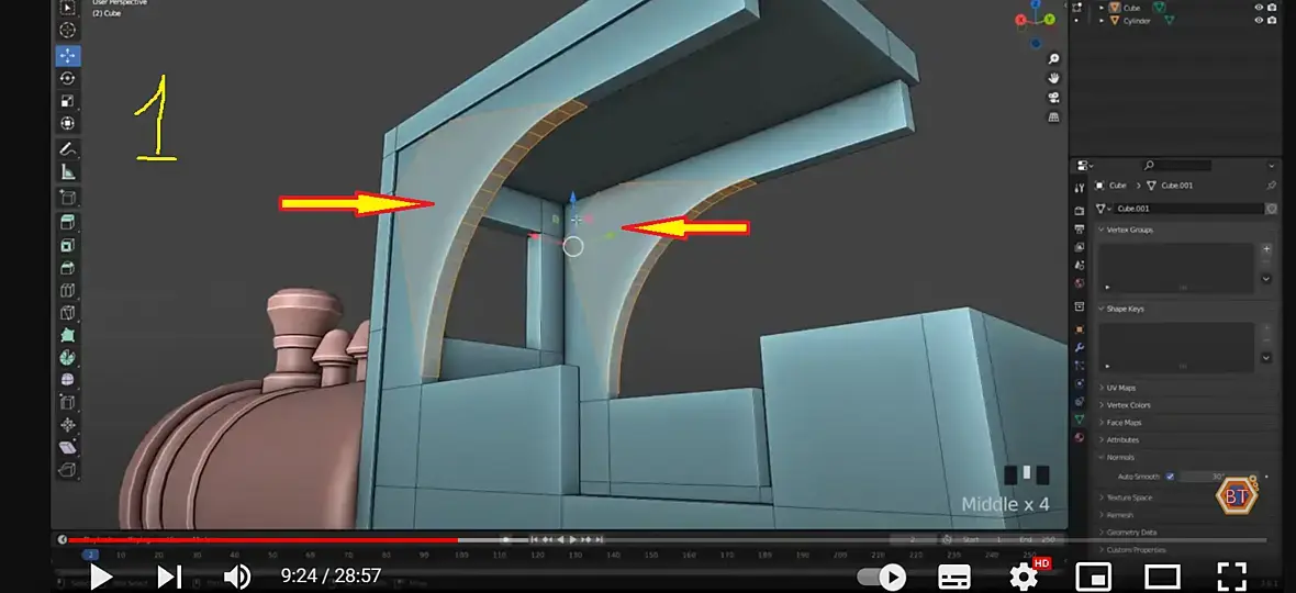 https://www.youtube.com/watch?v=rgHeJ8QGCps& ;t=453s . Но столкнулся с абсолютно загадочными ( для меня ) моментами . Три дня безуспешных мучений. С 9:24 по 9:27 каким то образом исчезает крыша , стенка и полукруглые боковины ( стрелки на скрине 1) , а уже с 9:22 по 9:31 всё появляется снова , да ещё и вырезанными внутри полукруглыми боковинами ( стрелка на скрине 2 ). Подскажите подскажите как это так ловко получается . Даже на скорости 0,25 никак не могу уловить секрет этого фокусника . Заранее благодарен за ответ .