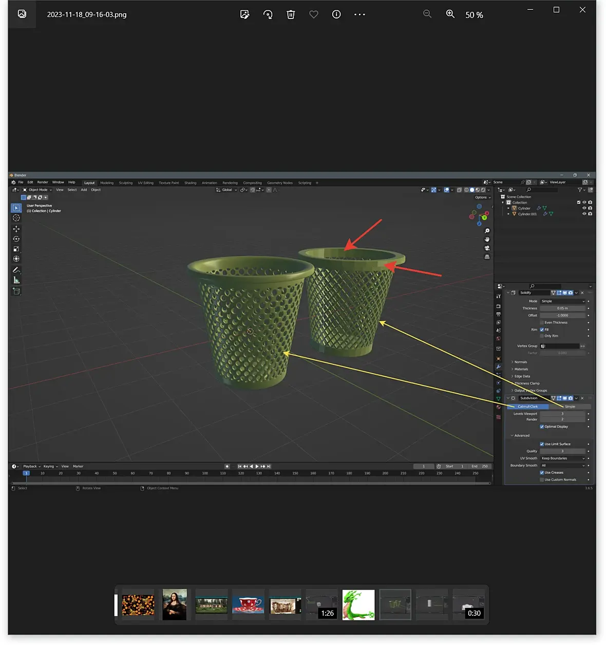 У меня очередной вопрос . Создал мусорную корзину .Хотелось сетку получить в ромбик ( корзина справа ) , которая получается в режиме " simple " , но её не получается сгладить ( красные стрелки указывают ) . А вот если перейти в режим " Catmull - Clark " сглаживает отлично , но сетка получается в дырочку ( корзина слева ) , чего не хотелось бы .