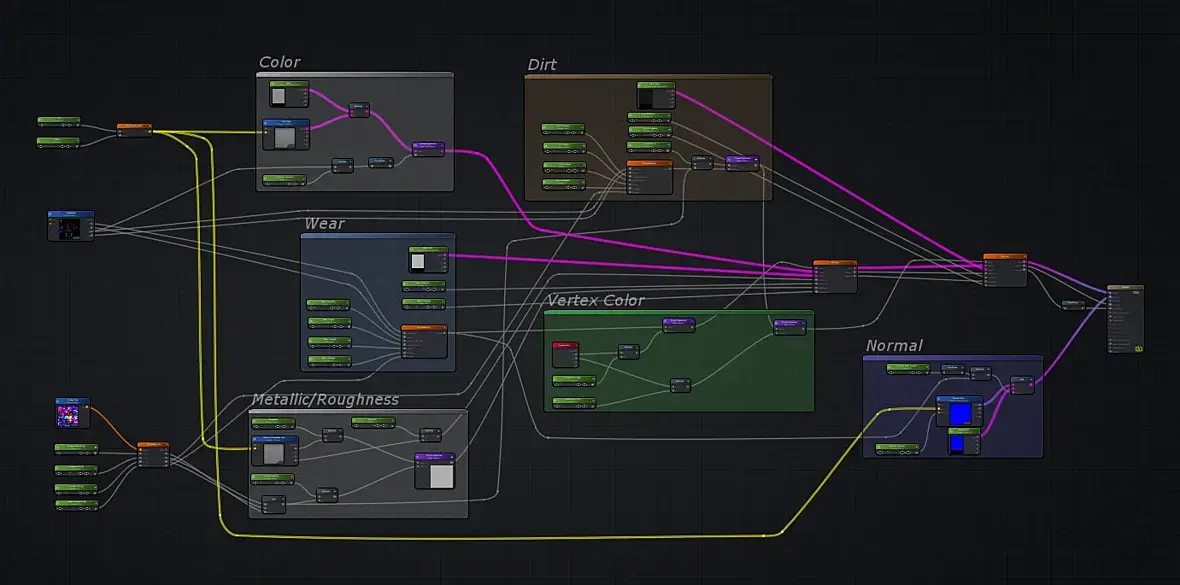 Далее я препарировал основной мэш, запёк курватуру геометрии, а так же курватуру с декалей лежащих поверх мэша, тут короче трюк, если кому интересно (могу подробнее), то подобное можно провернуть в икснормале. Всё это так же раскидал по ргб каналам