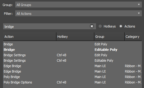 Пытаюсь добавить, но не работает. Пробовал сначала сделать горячую клавишу, не сработало. Пробовал в квад меню кинуть - не отображается в квад меню. пробовал сделать отдельный тулбар - опять же не работает. (нажимаю - но ничего не происходит и слетает выделение) "connect" и прочие часто пользуемые назначил - работают без проблем, а с "Bridge" какая то беда. "Bridge Settings" - так же не срабатываетможет кто сталкивался почему не срабатывает?