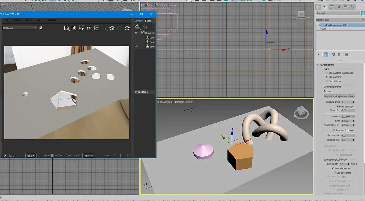 В VRay тоже самое. В VRayDisplacementMod. Можно вообще вместо карты закинуть VRayDistanceTex. С подключенной геометрией и двигать ее в процессе, отверстия соответственно тоже будут менять положение.