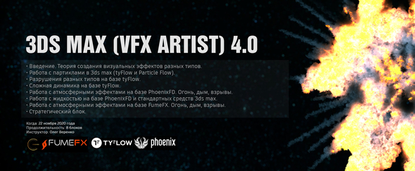 Сборник содержит 16 часов видео. В курсе мы будем работать над основным шотом - буря (1-й в презентации) а так же около десятка более простых. Затронем все типы динамики - Particle, PhysX, ткани, сыпучие поверхности (песок, снег), мягкие деформируемые тела, фрагментация и разрушения, изгибы и столкновения.
