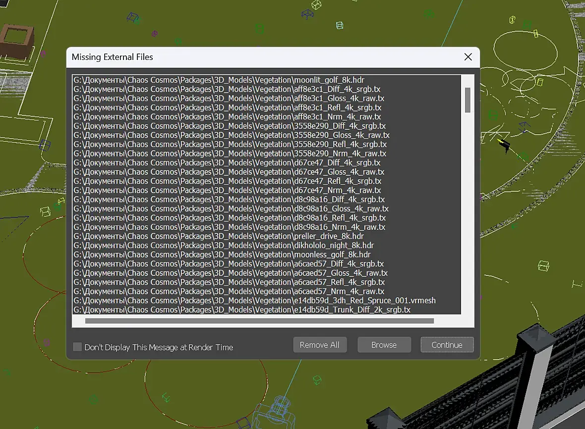 Доброго дня, очень нужна помощь знатаков( Сделал сцену экстерьера, много моделей там было из библиотеки Chaos Cosmos. Жесткий диск перегрузился, и я решил все тяжелые папки (рабочий стол, загрузки, документы и т.д.) перенести с диска C на диск G (их у меня всего 2). Соответственно тем самым нарушив все пути. К текстурам и моделям все удалось восстановить без проблем, а вот модели Чаос Космоса исчезли. Вероятно, можно каждую модельку прописать отдельно через Asset Tracking Toogle, но их там под сотню, они все по разным папкам (в основном растения), я просто сойду с ума. Были все на C/ Документы/ Сhaos Cosmos/ моделс/ растения и дальше каждое растение в каждой отдельной папке с еще несколькими рядом. Поменяв все на G/ Документы/ Сhaos Cosmos/ моделс/ растения- чуда не произошло. Галочки Add Suppath там нет, надо отдельно все прописывать. Если вдруг кто с подобным сталкивался, или знает решение данной проблемы- прошу, помогите, пожалуйста!