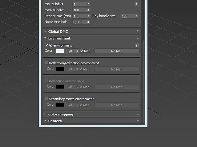 Причем Энвиронмент лучше настраивать в меню нажав клавишу "8" на главной клавиатуре. Там же можно настроить и экспозицию, выбрав настройки вирея. Я делаю так: экспозицию камеры и в настройках Энвиронмента связываю, мне иногда удобней тестовые рендеры делать со вьюпорта.