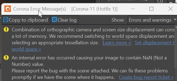 эти точки явлюятся ошибками рендера, про что пишут в окне про NaN, вылезать могут от разных вещей, включая и от предидущей ошибки из за ортографической камеры, а может из за каких то материалов, или плагинов типа сторонних процедурных карт или кривых hdri. Анализировать сложно, потому что может не исправится в сцене даже если исправить проблему без перезапуска, самое простое наверное по кускам мерджить в новую сцену или поискать из того что я написал выше. можно попробовать обновить корону, возможно там исправили подобные проблемы, или даже отослать сцену разрабам на форуме, если такое будет в 14.1 короне они будут заинтересованны в фиксах, если дело не в плагинах.