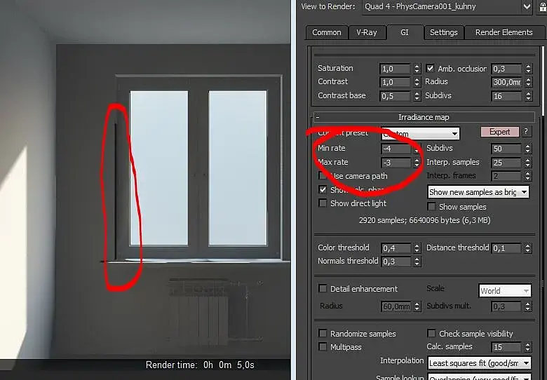 Такое ощущение что там проблемы с геометрией... В откосе.А что с материалом ?Накинь серый и отрендери и покажи тут?Пересветы от солнца. Я считаю что нужно начать последовательно освещать .1.сбросить насройки вирея,2 добавить солнце с маленьким мультом 01. 3 .Сермат рендер. 4.в зависимотси от результата крутим камеру добавляем портал 5.опять рендеримв сырмате. В итоге автор уснул... Я тоже иду спать