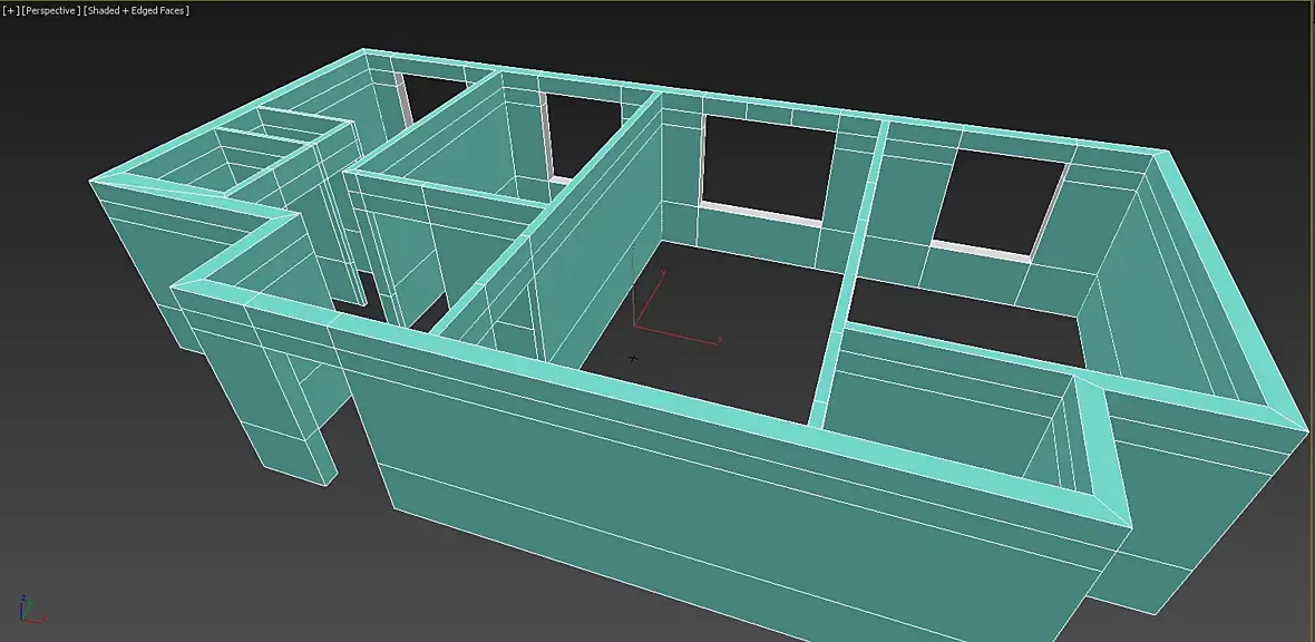 Стены делал так: обводка .dwg. сплайном - Edit Poly - полигоны в местах проемов окон и дверей режу Cut. После все полигоны поднимаю Extrude до уровней высот подоконников, дверей, окон. После Bridg проемы окон и дверей. Убираю лишние полигоны оставшиеся в дверных проемах. И Cap снизу получившуюся модель. Получается все быстро.