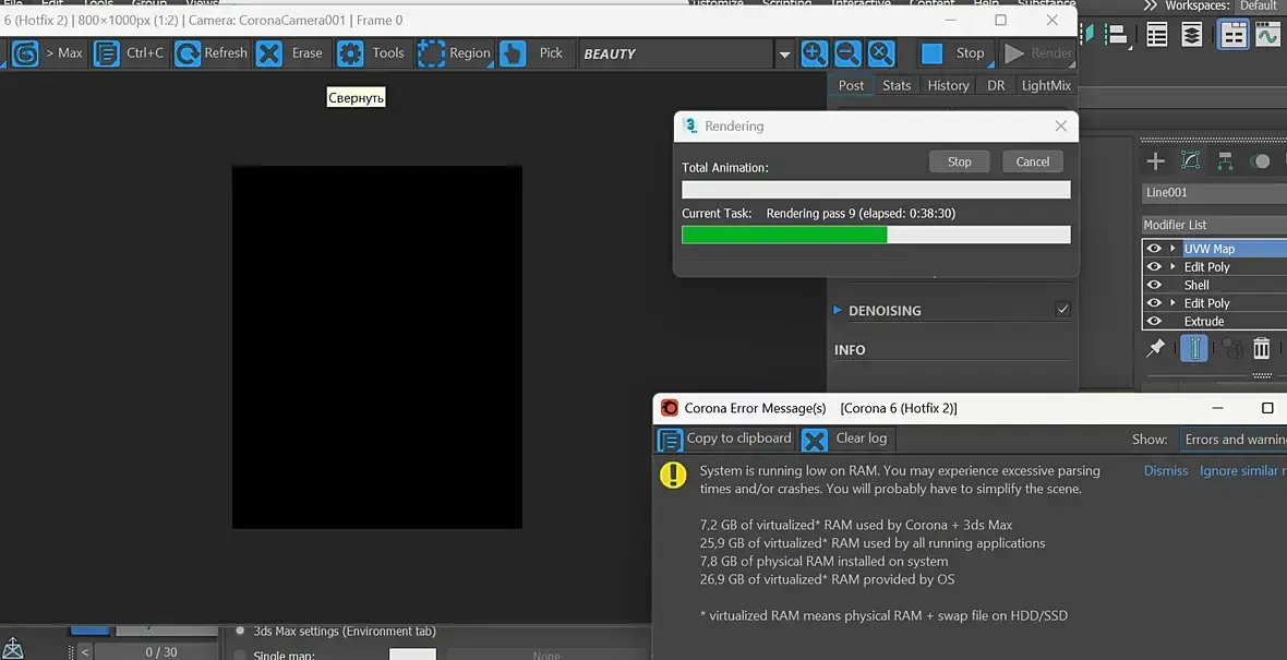 Так же на скриншоте старая версия Короны 6. Настройка компрессии памяти у нее по моему еще была спрятана в Dev/Debug скрытых настройках в Settings, галочку там поставить для доп настроек. А еще в свежих версиях появилась Out of Core выгрузка CoronaBitmap (с обычными Битмапами НЕ работает), это тоже экономит память. Но это все равно жесть, 8GB оперативки это очень мало. Можно продолжать давать еще кучи мелких советов как сэкономить по памяти но легче пойти и купить себе хотя бы 32гб ОЗУ.