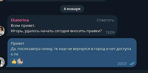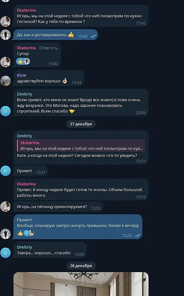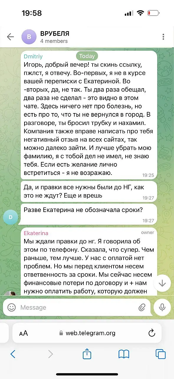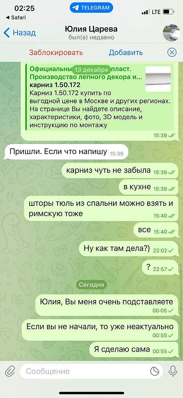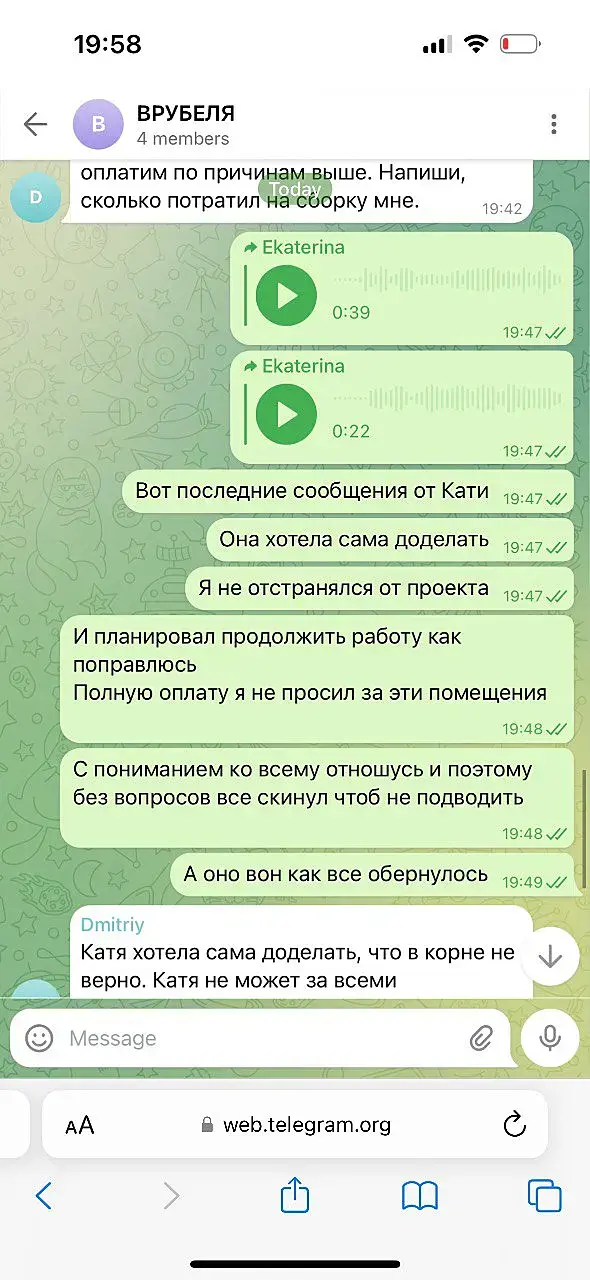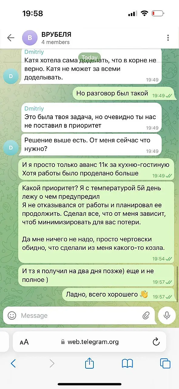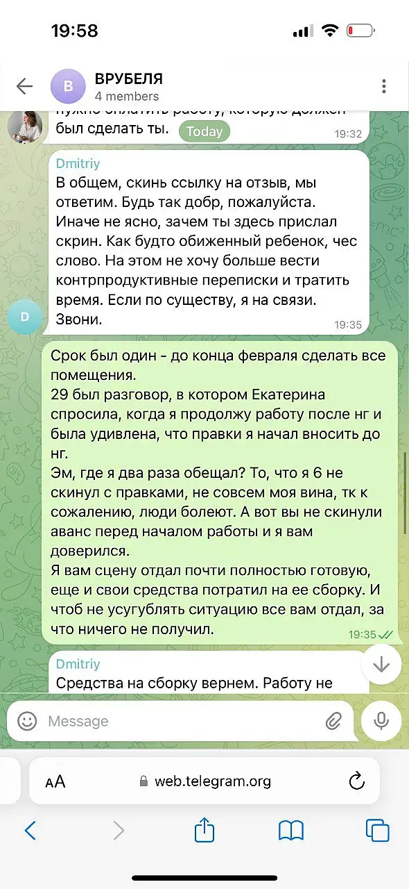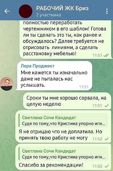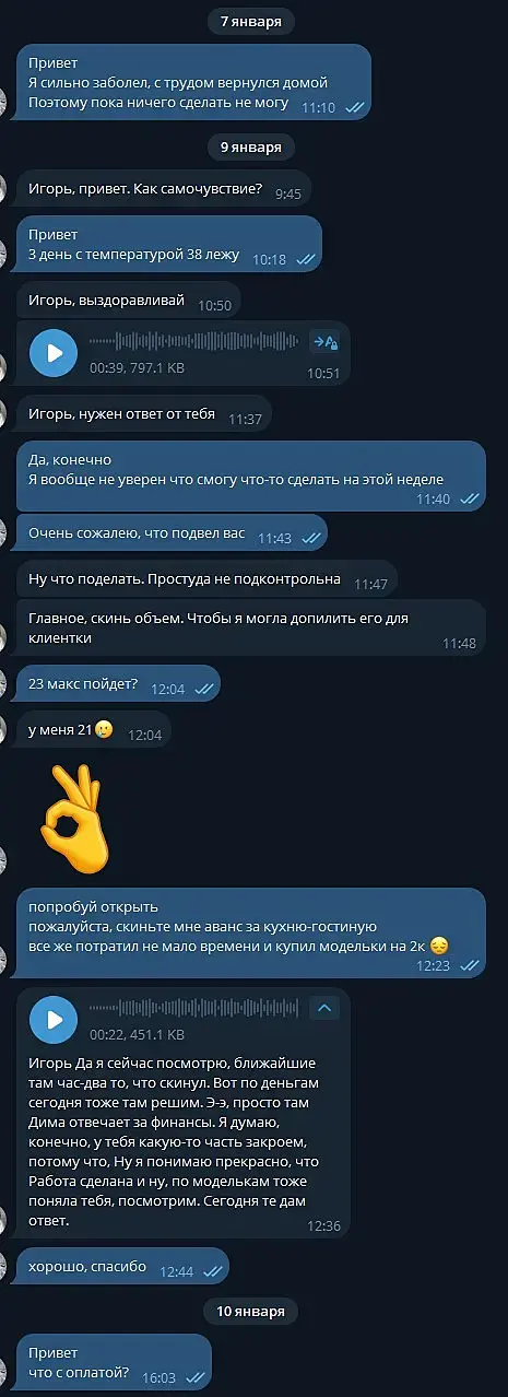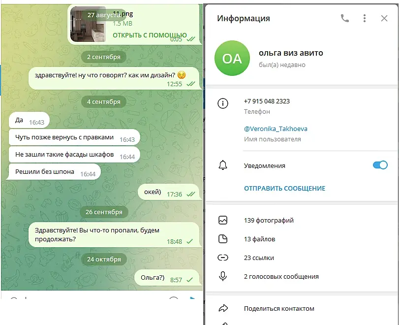 Вероника Тахоева (Ольга) тг @Veronika_Takhoeva +79150482323 Итак предоплата 50% дана, визы сделаны по ТЗ и отправлены, жду правки. Жду правки уже два месяца и ничего. Решаюсь написать на Авито, где она меня нашла и оказывается, что ей не понравилось со мной работать, она добавила в чс в телеграмме и просто решила не платить, хотя сказала ждите правки))) Непонятно в чём была проблема сразу сказать это, думаю я не первый визер, который сделал всё за полцены :) Ну и предъява была в том, что я нервно исправляю правки (извините, но когда на каждую деталь оправляешь рендер в надежде, что всё готово она вдруг вспоминает, что надо что-то ещё - думаю такое любого не обрадует, но тем не менее я стойко продолжала) как видно по скрину тг я немало рендеров отправила.Переписку прикрепляю: