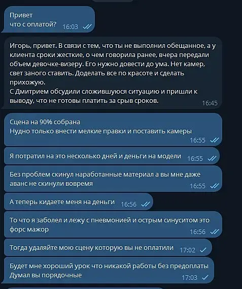 Перед новым годом начал проект, обговорили сроки, всех все устроило. Начал работу без аванса, показал первые превьюхи раньше ожидаемого, получил правки.Пока вносил правки, оказалось, что их не ждут раньше после новогодних праздников, поэтому не стал торопиться и 30 отложил работу до 5 января.Из-за сильной болезни не смог вернуться домой вовремя и продолжить работу и показать правки 6 января, о чем 7 января известил заказчика. Ответ получил 9 января. Заказчик попросил скинуть наработки чтоб не затягивать сроки, тк мое самочувствие только ухудшилось, без каких-либо проблем, скинул все наработки архивом. (сцена полностью собрана, частично внесены последние корректировки, отсутствовали камеры). Тк продолжить работу над этим помещением не было больше возможности, попросил скинуть хотя бы аванс (50%), но получил неприятный ответ. После состоялся телефонный разговор, в котором мне сказали, что я два раза сорвал сроки и ничего оплачивать мне не будут. Причем я всегда на связи и у них есть мой номер телефона, никаких претензий я не получал до этого. В итоге я заработал -3 рабочих дня и -2к на модельки ) До этого объекта выполнил для них три квартиры и проблем не было. Атмосфера Дизайн Дмитрий Перцев