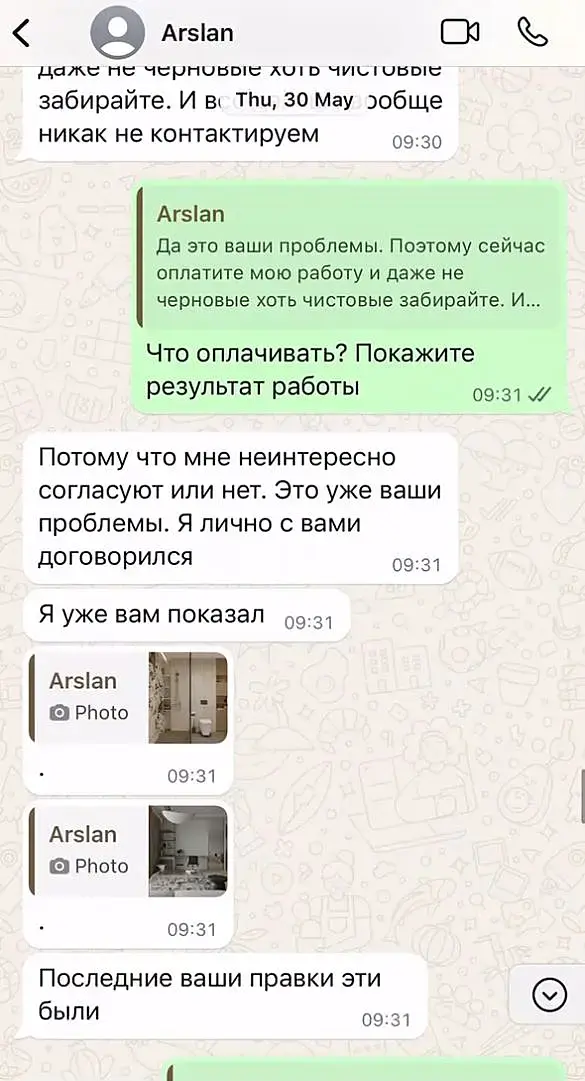 Выслала первые черновые рендеры заказчикам. Они знали, что у них будет право внести какие-то изменения в проект и прислали свой список (там было около 10% измений от общей массы проекта, в основном только ванная комната, потому что они отказались от плитки, которую Арслан так и не смог сделать как на референсах). В этот момент у меня был перелет на несколько дней и, чтобы не тратить время, я просто переслала этот список, но по декору ничего не писала, так как мне нужны были ракурсы без декора, чтобы опять в фотошопе его расставить (до этого визуализаторы либо присылали модели на выбор, либо сами все расставляли и претензий не было, но с Арсланом это не работало и мне приходилось давать готовый вариант). Он, не дожидаясь остальных правок и декора, просто закидывал в чат скрин-шоты внесенных правок, при чем в очень плохом качестве, многого было не разобрать. Я уже понимала, что нет смысла ему писать (он все равно не сделает по референсам), и предложила организовать онлайн встречу, чтобы в живом формате подкорректировать моменты, которые не устраивают и расставить декор. Он согласился, но сразу при встрече начал спрашивать – зачем мы встретились и говорить, что он сейчас в “живую” не может работать, якобы из-за параллельного рендера другого проекта. При этом начал все таки вносить изменения, я удивилась и подумала, что наверное просто не поняла его. Но в процессе он сообщил, что проект вообще-то уже готов и все правки он ранее уже внес и дальше что-то делать отказывается.