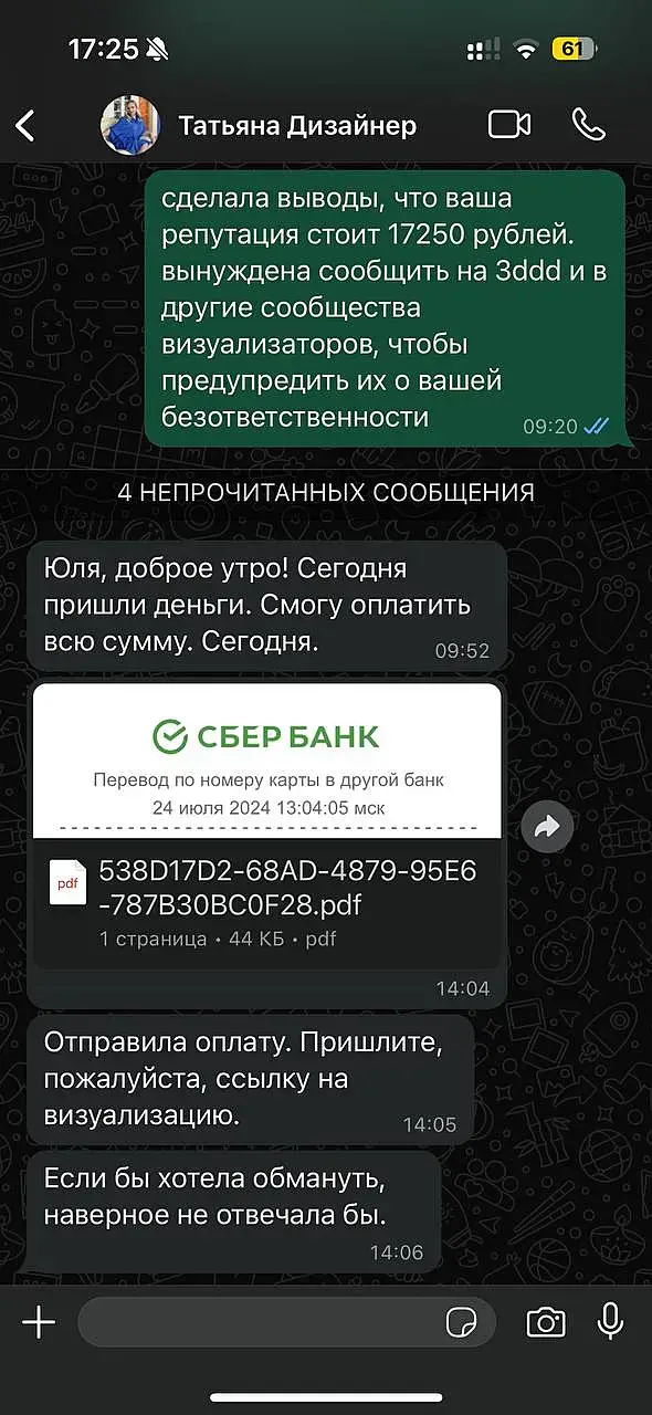 Удивляюсь ушлости некоторых дизайнеров, которые жалуются на "таких плохих заказчиков, которые задерживают оплату" и из-за этого дизайнер якобы не может оплатить работу визуализатору. Есть у меня парочка таких. Ну хоть бы не позорились. В жизни никогда не поверю, что у дизайнера нет 20 т.р. Либо такими действиями дизайнер признает, что он настолько фиговый специалист, что к нему не идут клиенты и поэтому он не может заработать эти 20 т.р.