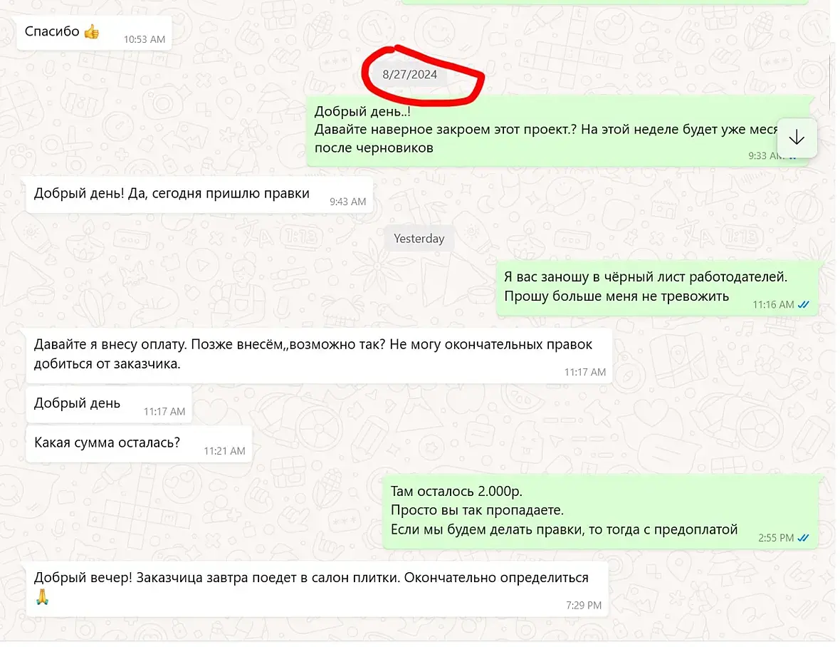 Не советую связываться. Полный геморрой. Сотрудничила с ней раньше, удалила из контактов, т.к. решила, что хватит. Она пропадает и задерживает оплату. В последний раз пришлось писать её начальнику, который её рекомендовал, только после этого поступила оплата. Ещё обозвали меня истеричкой, за то, что начала требовать свои деньги после полуторомесячного ожидания, от неё были только обещания - на след. неделе, завтра и т.д. В этот раз ответила ей по ошибке, один клиент дал мой контакт другому, пришло сообщение и я ответила, не глянув на аватар. Только потом увидела её. Т.е. я ждала другого человека, а по иронии сообщение пришло от неё и я ответила. Потом решила ок, один санузел, может протянем без проблем и будут деньги на карманные расходы. Но здесь появились те же проблемы. Может её уже кто-то знает. Человеку всё по барабану.