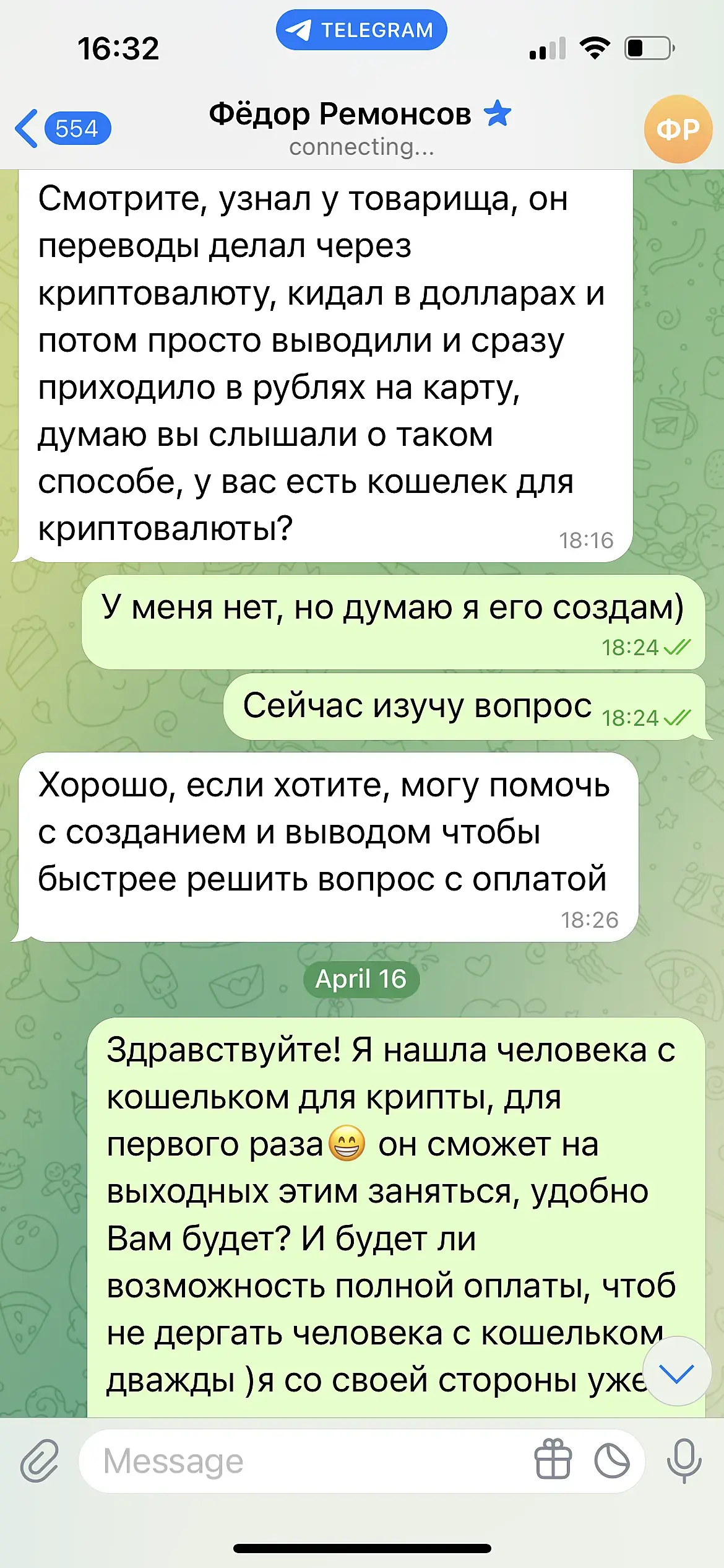 Тоже написал Федор Олегович Ремонсов, на этот раз у него румынский паспорт. На нормальные криптокошельки у него не получается перевести по неведомой причине. Кидает ссылку на какой-то мутный Siobit, который не гуглится даже. Явно мошенник, ОСТЕРЕГАЙТЕСЬ