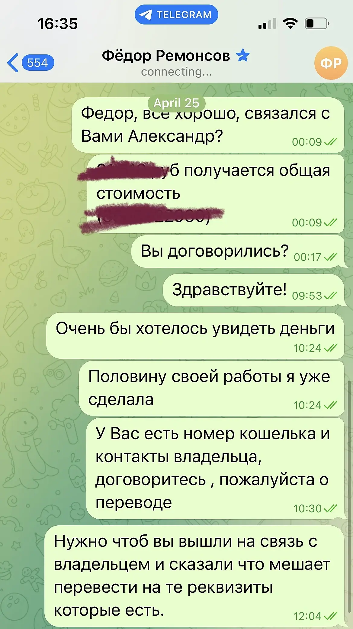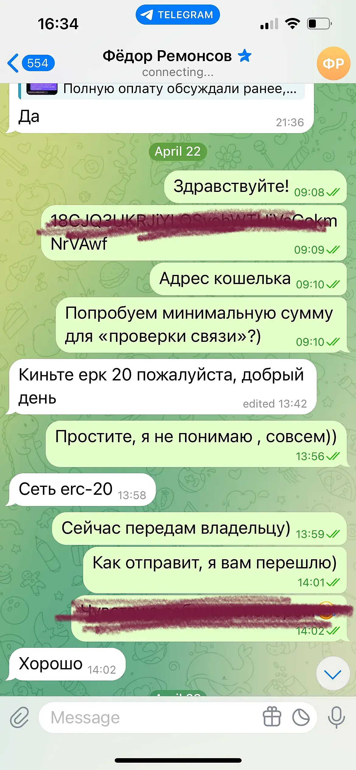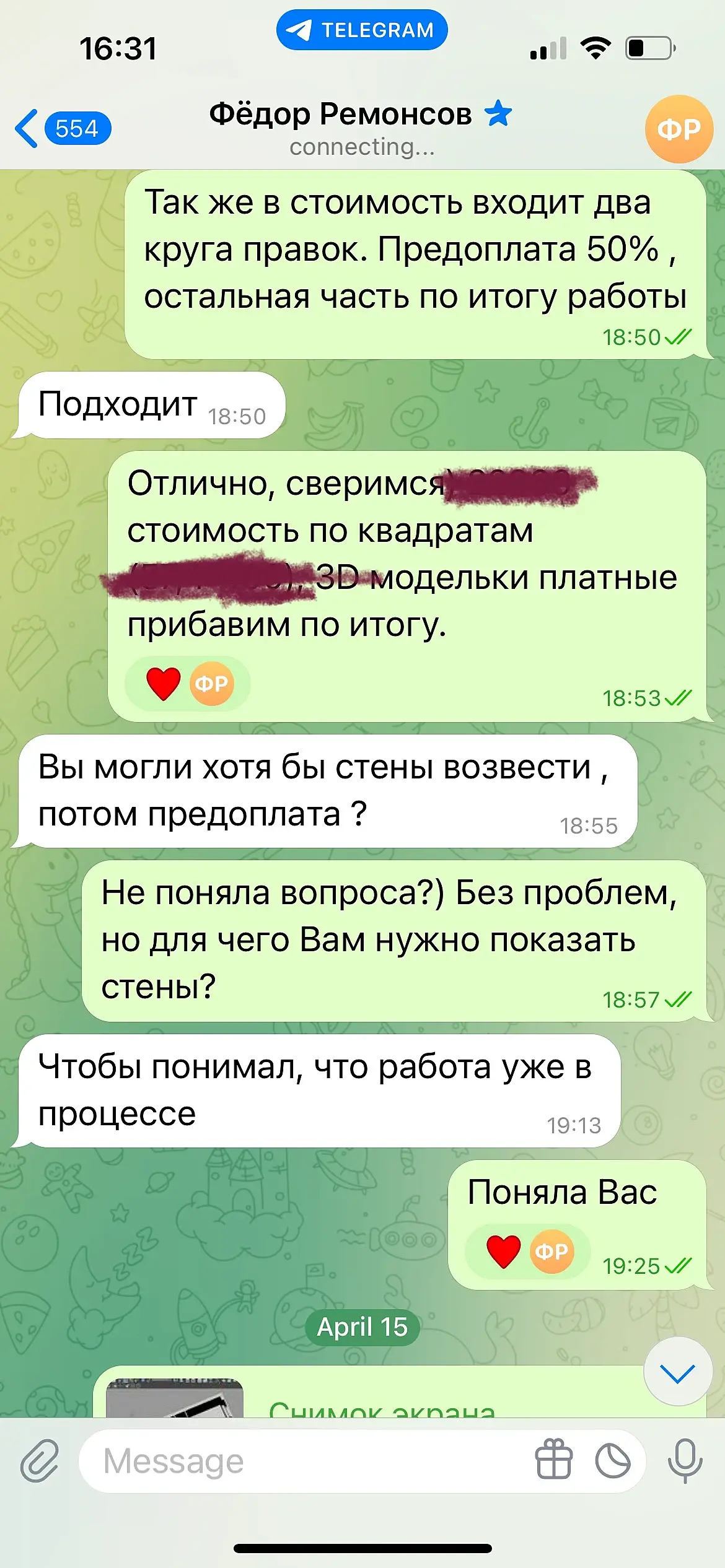 Мошенники в ТГ! Написал некий Федор Ремонсов, сославшись на то, что нашел мое резюме на 3ddd. Скинул ТЗ, обсудили сроки и детали и на момент предоплаты выразил недоверие и попросил для начала «возвести стены» (теперь я знаю, что не надо так доверять людями и уже нашла информацию о нем жалобы в ЧС). Далее выяснилось , что он не может переводить деньги в банки России и неуемно стал предлагать организовать мне кошелек для крипты и конечно же помочь ее вывести. Какая подозрительная щедрость, подумала я и отказалась, предоставив адрес уже действующего кошелька для перевода. И тут «Федор» начал увиливать а позже вовсе перестал выходить на связь, так как в его планы вообще не входила оплата чего либо). Будь осторожен, дорогой коллега! @fady_remon33