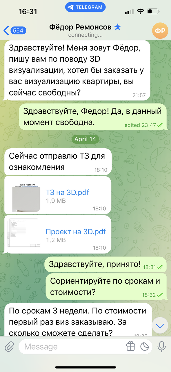 Мошенники в ТГ! Написал некий Федор Ремонсов, сославшись на то, что нашел мое резюме на 3ddd. Скинул ТЗ, обсудили сроки и детали и на момент предоплаты выразил недоверие и попросил для начала «возвести стены» (теперь я знаю, что не надо так доверять людями и уже нашла информацию о нем жалобы в ЧС). Далее выяснилось , что он не может переводить деньги в банки России и неуемно стал предлагать организовать мне кошелек для крипты и конечно же помочь ее вывести. Какая подозрительная щедрость, подумала я и отказалась, предоставив адрес уже действующего кошелька для перевода. И тут «Федор» начал увиливать а позже вовсе перестал выходить на связь, так как в его планы вообще не входила оплата чего либо). Будь осторожен, дорогой коллега! @fady_remon33