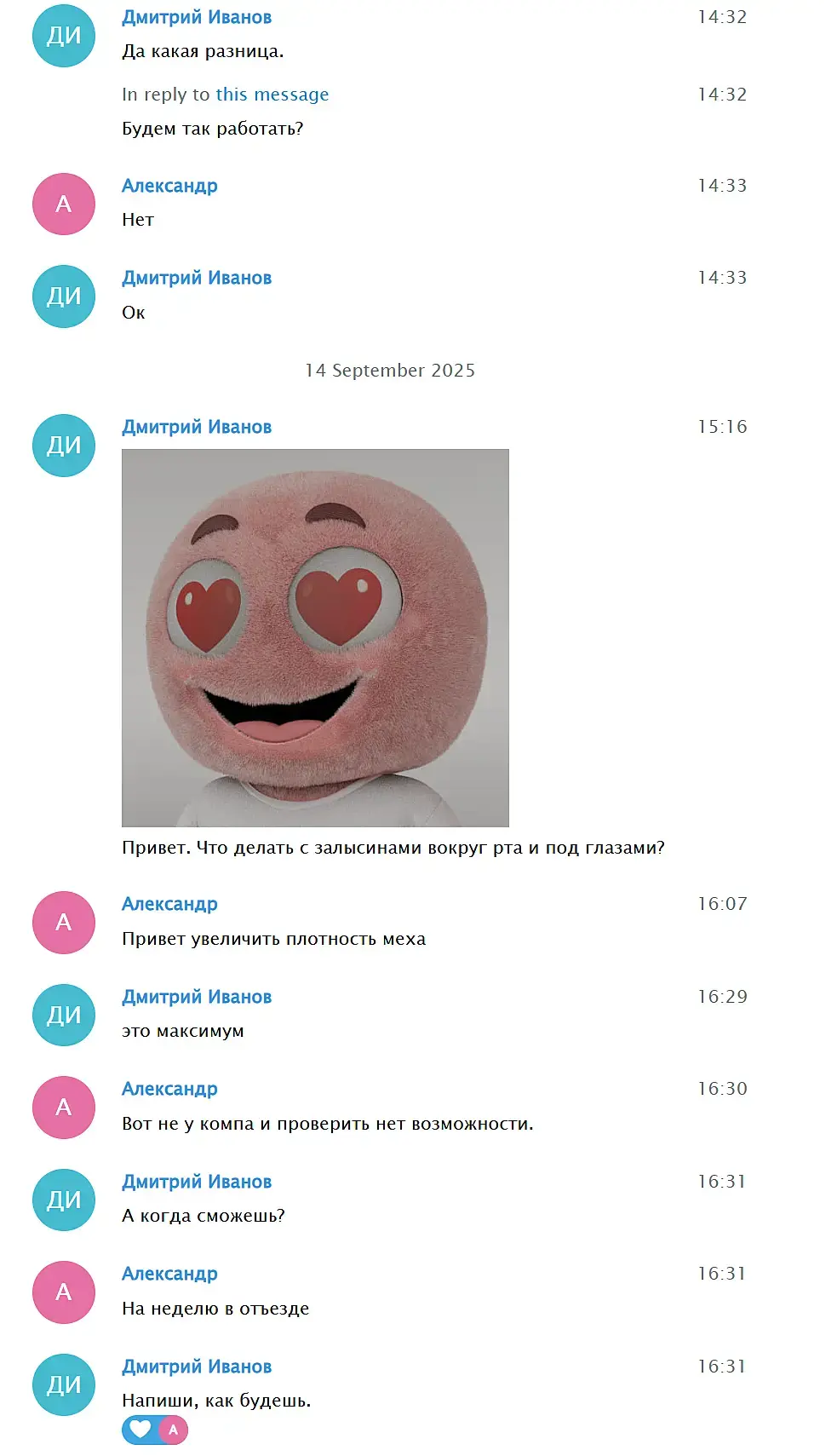 14 сентября заказчик скидывает мне картинку с проблемой по модели. Это прошло 12 дней со дня принятия работы. За этого период ни слова от него не было. Но ок, я сказал что нет возможности, в отъезде, буду через дней 7. По факту в больничке лежал в стационаре. Договорились что он подождёт. Всё это вы сейчас ниже видите на скрине переписки.
