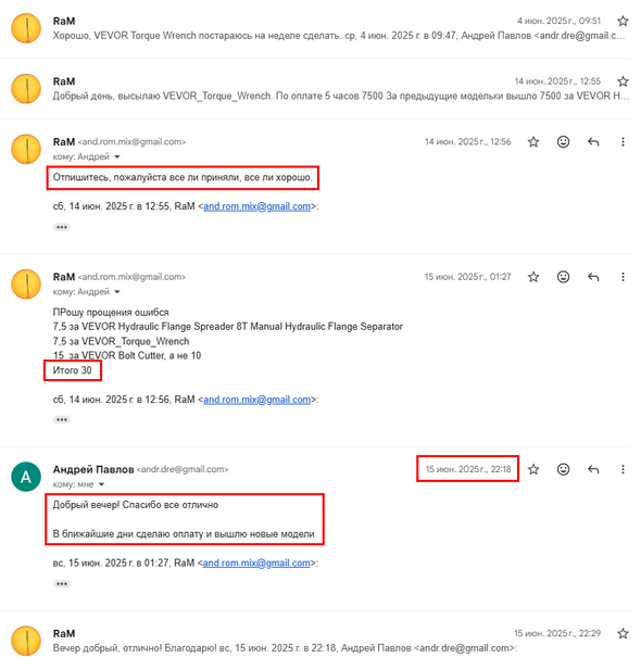 В июне я ему отправил как обычно 3 готовые модельки, огласил цену и как обычно спросил все ли хорошо с ними, на что получил утвердительный ответ. Всю переписку скидывать не имеет смысла, она долгая и нудная.