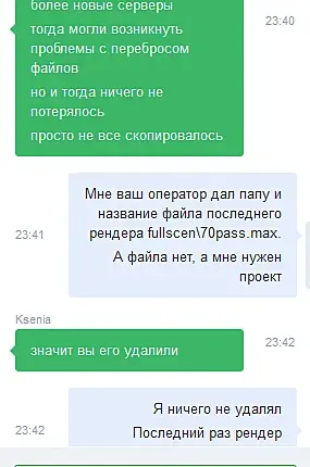 На главной странице написано, что серверы с 64Гб ОЗУ. Отправил тяжелую сцену, которой нужно было 48ГБ для рендера. Начались проблемы, рендер долгий был и закончился с ошибкой. Спросил у менеджера, почему так долго, он попробовал сам, тоже самое. Посмотрел логи с фермы, оказалось, что запущена сцена на 32Гб. Попросил вернуть деньги, т.к я не смог воспользоваться их услугами. Менеджер замялся, напомнил через неделю, написав им письмо.
