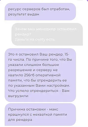 Добрый день. Что бы снять все вопросы по поводу нехватки оперативной памяти на вашей рендер ферме я прислал вам скриншоты где проект успешно рендерится на 256гб оперативки с разрешением не 16000 пикселей, как у вас я ставил на рендер а почти 23000 пикселей... все рендерится, причем с нагрузкой на оперативку 90гб. Как это называется? Предполагаю что Вы посмотрелина разрешение картинки и решили что можете больше денег взять за такое изображение разбив задачу на 4 части или 6 как вы мне предлагали (разрезать изображение на 4 части и потом клеить их в фотошопе в одно целое) Я просил Вас в чате, пожалуйста просто верните мои средства, предупреждал что пойду в интернет и добавлю вам популярности.