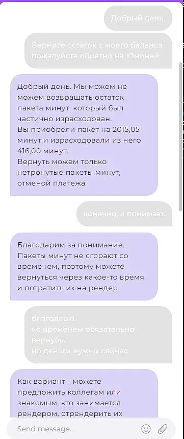 Мало того что не отрендерили мне картинку так еще не хотят возвращать остаток средств.