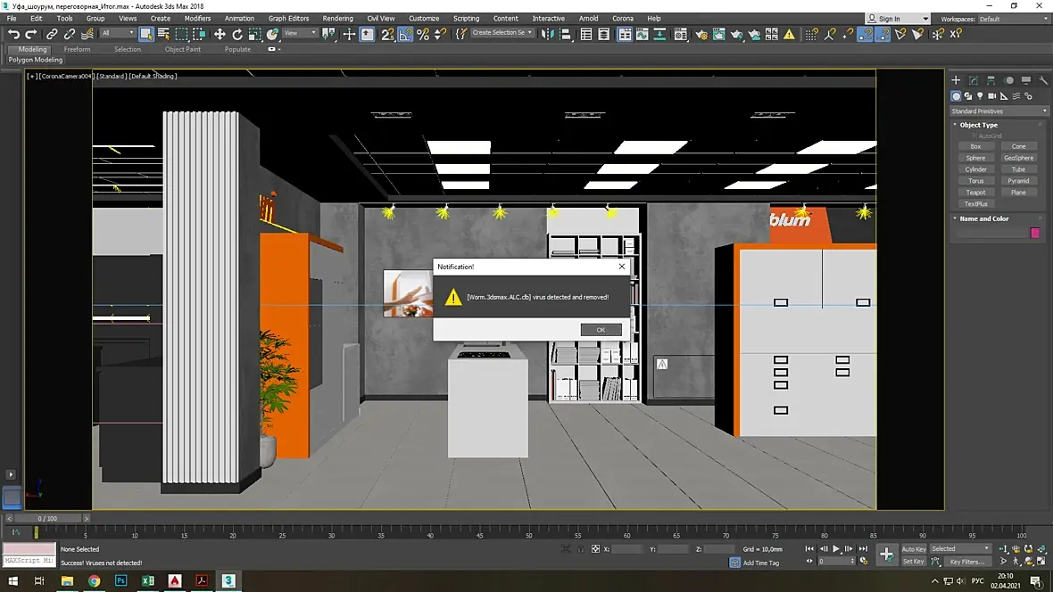 А вирус распознал банально от лени: перетаскивал двух-объектную решетку из другой сцены, т.к. лень было моделить заново, и тут то во время чистки слоев он попался гаденыш.