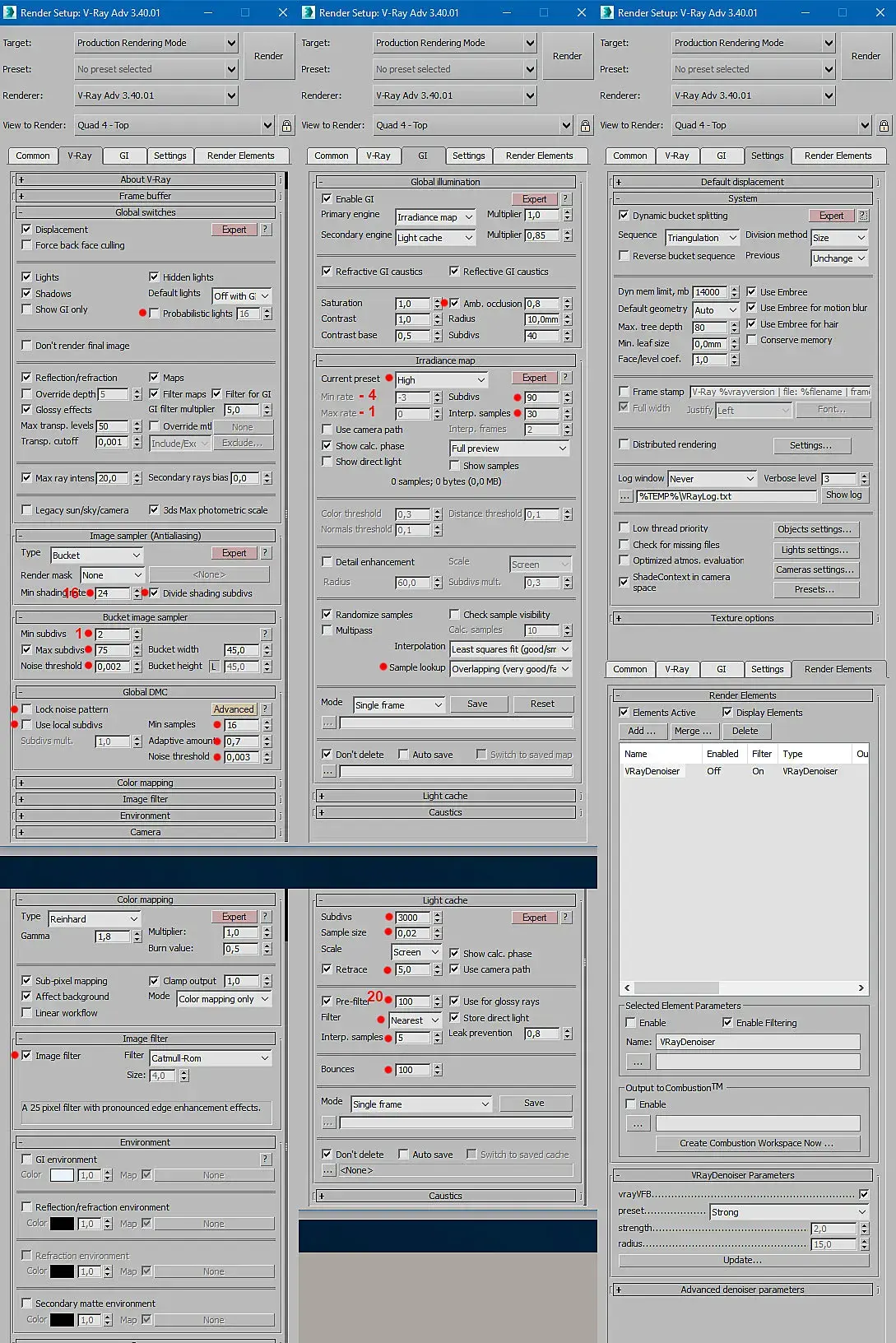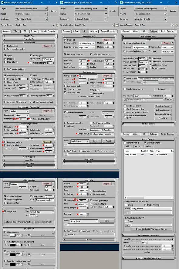 Так же настройки бывают усредненные, а бывают уникальные под каждую сцену. ВиРей "с коробки" заменив прогрессив на бакет уже выдает приличный результат, зачем столько крутилок крутите бессмысленно?