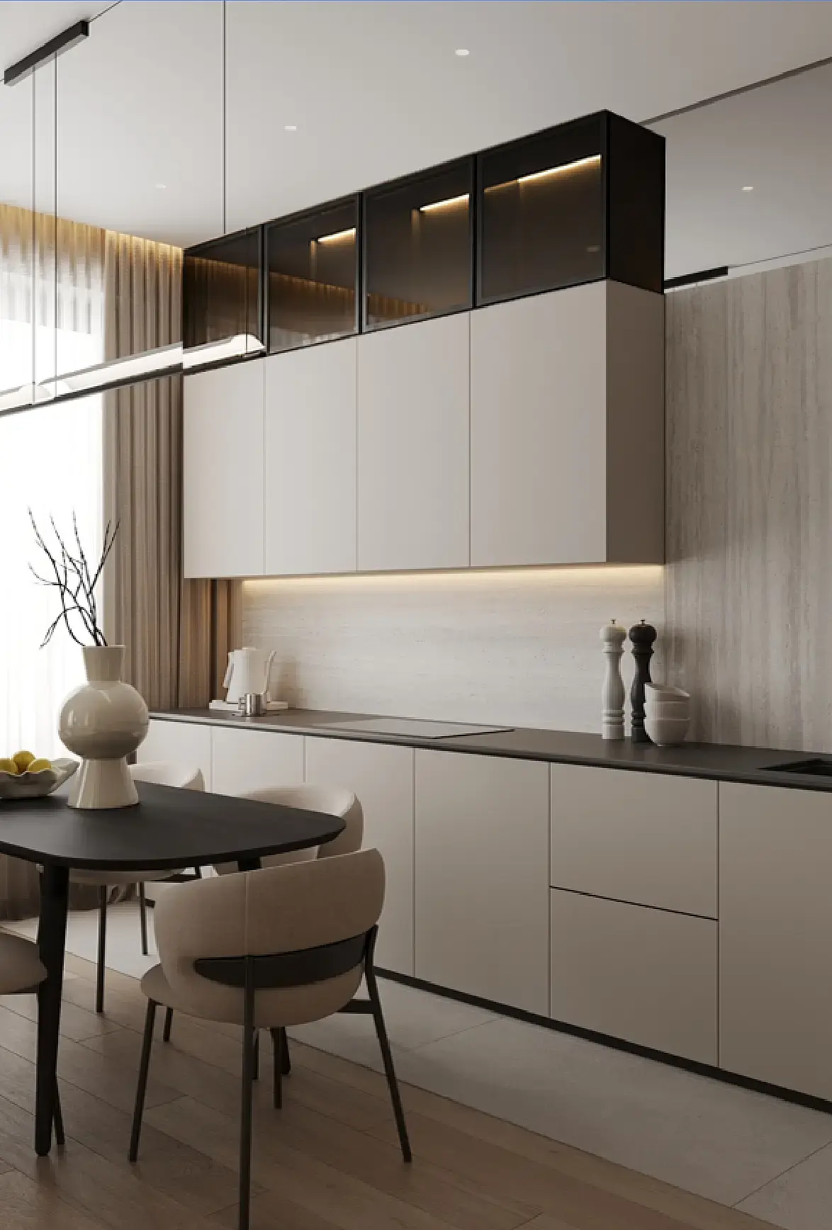 основная причина делать кхню под потолок - это проблемы с вытяжкой. А так тут хороший вариант предложили - фальш стена. Жалко конечно терять столько пространства ради вытяжки, но варианта особо не вижу) Хотя можно в пол уйти, у нас же шкафы всегда на 100мм приподняты, но опять в районе фартука короб какой то нужен до нижних шкафов)))