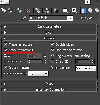 А если воткнуть стекло в новую сцену и создать заново материал двигаясь по каждому пункту. Т.е. сначала черный диффуз, потом рефлект на полную, затем рефракт.
