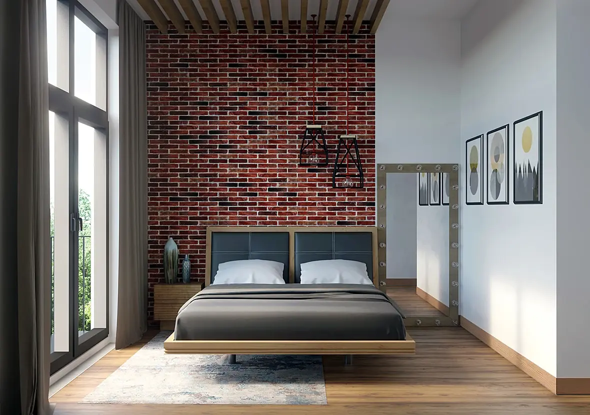 Сделала бы другую постель по настроению, незаправленную, толстое одеяло смятое, подушки мягкие, осевшие , чтобы на контрасте было - ровные аскетичные линии стен и пола - хаос в центре. Сразу появится акцент, куда смотреть. При этом, белье белое, но не блестящее.
