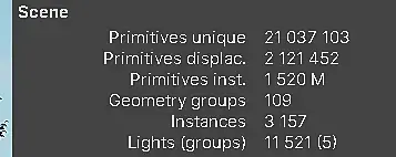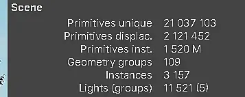 Primitives Inst - это значение треугольников инстансов. Если в сцене всего один инстанс раскопированный миллион раз, то даже если там миллиарды полигонов будет показывать, памяти это будет съедать минимально. Вот параметр Primitives unique - прказывает число треугольников уникальной геометрии и это отжирает память как не в себя) И тут в сцене 21 миллион полигонов не инстансной геометрии. и это вполне может отжирать дофига оперативки