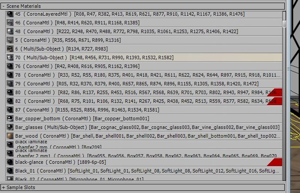 - If an entry in the Scene Material group shows a red wedge-shaped flag, then a Show Map In Viewport toggle is turned on for that material or one of its maps.