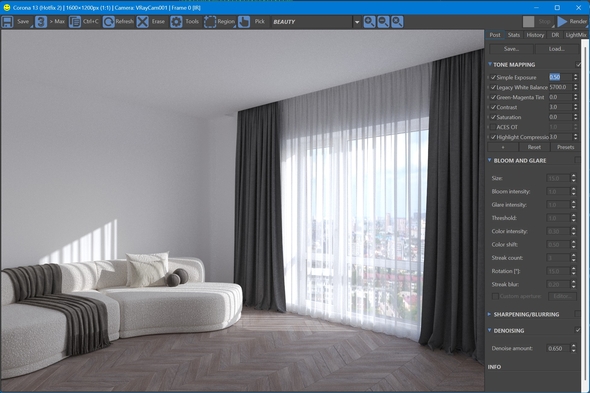 в V-Ray даже настройки занижены,но в Corona никак не получается настроить свет и главное тени,как в V-ray."Перешерстил" весь интернет,разные уроки, блин,что не так я делаю? Не получаются такие тени, как в вирее.Особенно сильно заметно над окном,переход стены в потолок,все как в тумане.Хоть с тюлем,хоть нет, и просто лайты ставил---нифига!Третий день долблюсь)) Хочется чтобы по простому,как в вирее(за что и люблю его)),солнышко поставил,небо и вот уже картинка,и воздух чувствуется,а там уже внутри сцены мудри как хочешь.(дополнит.свет и.т.д) .Подскажите плиз,что я не так делаю? Вот ссылка на сцены: