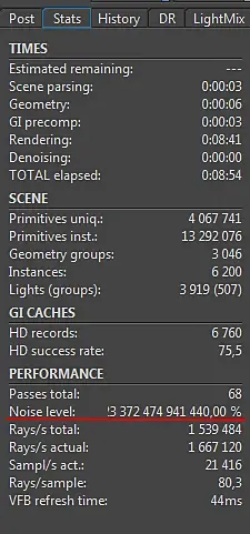 У кого-нибудь была такая проблема с Noise level? Подскажите пожалуйста как решить эту проблему? Сцена экстерьера, была создана в corona 1.5, рендерю в 1.6. Прокси все старые удалил, иначе вообще сцена падала.